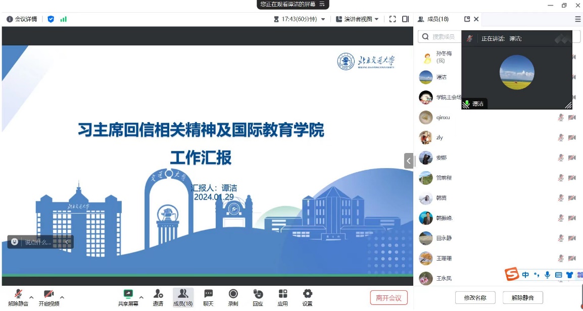 谭洁详细介绍习近平总书记回信背景、深刻内涵、重大意义,回顾我校70余年国际教育历程,重点介绍新时代我校积极响应国家“一带一路”倡议等重大战略需求,承担肯尼亚蒙内铁路大规模人才培养任务等工作,国际教育不断提质增效、国际化办学水平得到党和国家高度认可。谭洁表示,教育在国家外交大局、国际传播中发挥重要作用,要以习近平总书记重要回信精神为契机,持续提升学校国际交流合作水平,为推动“一带一路”建设高质量发展、构建人类命运共同体作出交大贡献。