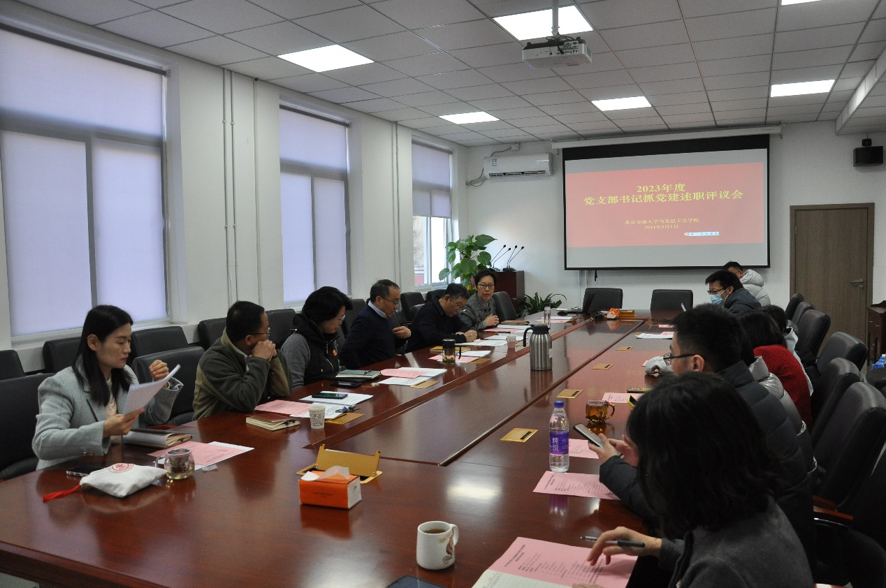 党委委员依次对党支部书记述职进行点评,特邀党建组织员康敬东就基层党建常规工作进行点评,他指出在过去一年中支部工作成绩斐然,开展形式多样的主题教育学习活动,全方位推动教学、科研高质量发展,真正做到了马院姓马,在马言马。下一阶段希望能够加强人才培养的力度,让更多的青年教师参与到支部工作中来,进一步以高质量党建引领教学科研高质量发展。